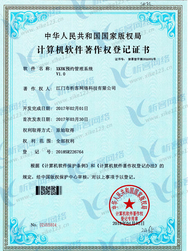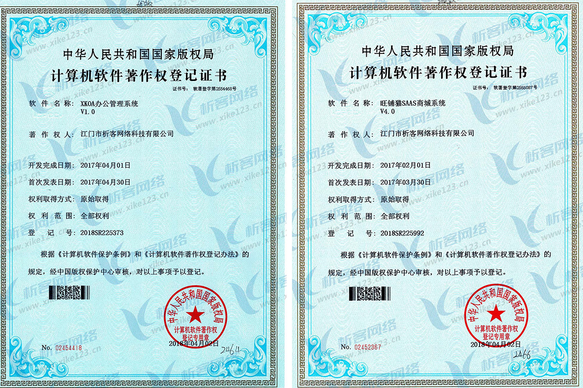 经中华人民共和国国家版权局考证,根据《中华人民共和国计算机软件保护条例》和《计算机软件著作权登记办法》的规定,近日,江门市析客网络科技有限公司自主研发的:XKOA办公管理系统、XKBK预约管理系统、旺铺猫SAAS商城系统三项软件产品获得《计算机软件著作权登记证书》。
